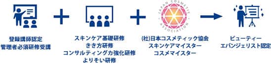 約1年間に及ぶ美容専門プログラムを修了し、一般社団法人日本コスメティック協会のスキンケアマイスター・コスメマイスター資格に合格した管理者が認定される社内資格です。