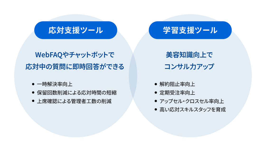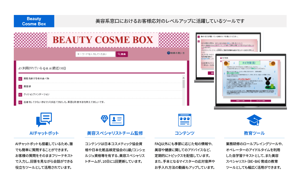 解約阻止率などのKPIを向上にNTMの美容カスタマー業務の運用支援ツールである、BCBを活用し、美容分野のオペレーター応対支援ツールと学習支援ツールとして運用しております。